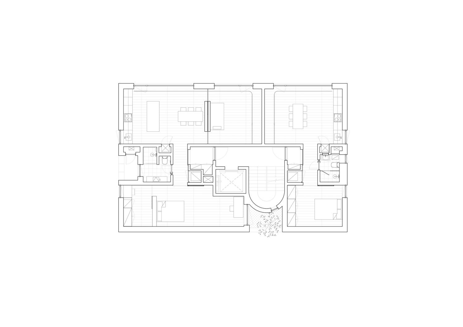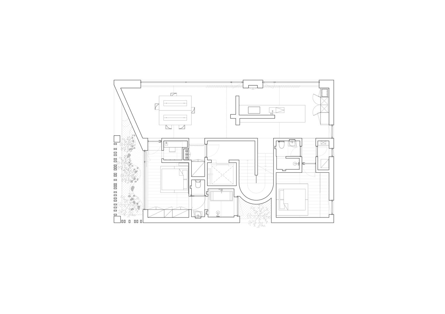 All non-loadbearing walls were removed and replaced with partitions that incorporate concealed storage. These new elements establish a clear sense of order, articulate the spatial relationships between rooms, and enhance the overall sense of openness while preserving visual separation where needed.
