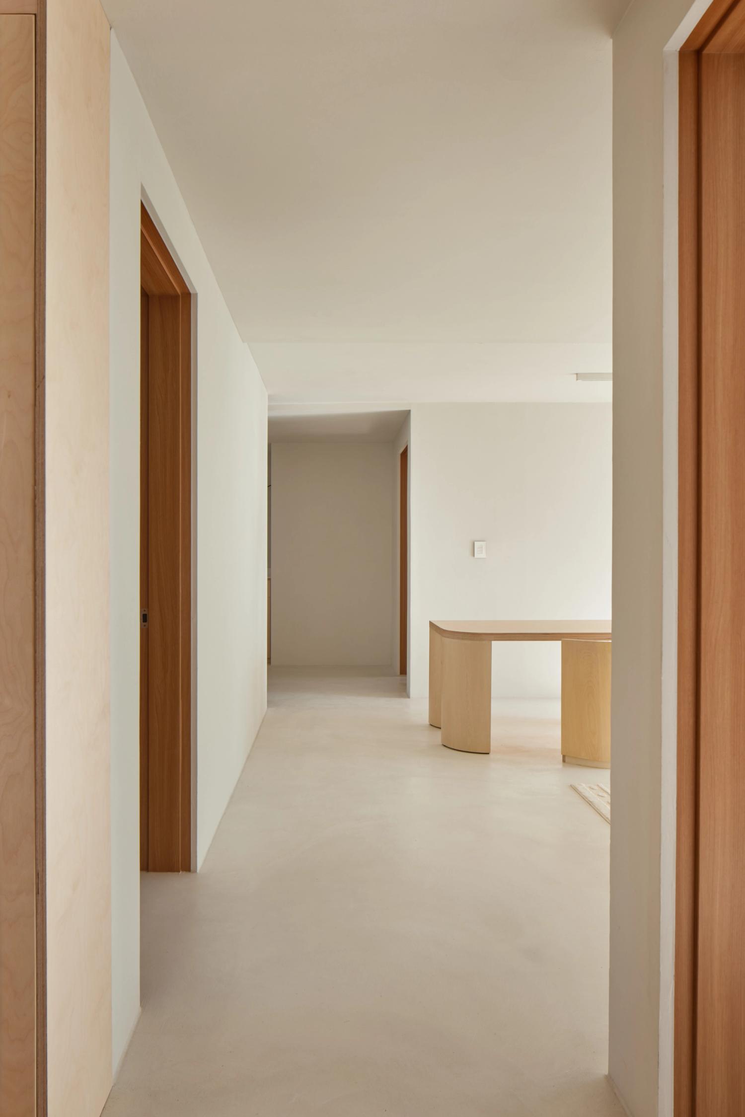 This renovation reconfigures a three-bedroom apartment in Shanghai for an art curator, transforming a disjointed layout into a coherent and expansive living environment. Originally, the apartment lacked clarity: the living room was encircled by bedrooms and bathrooms, with multiple doors visible from almost every angle, creating visual noise and spatial ambiguity.