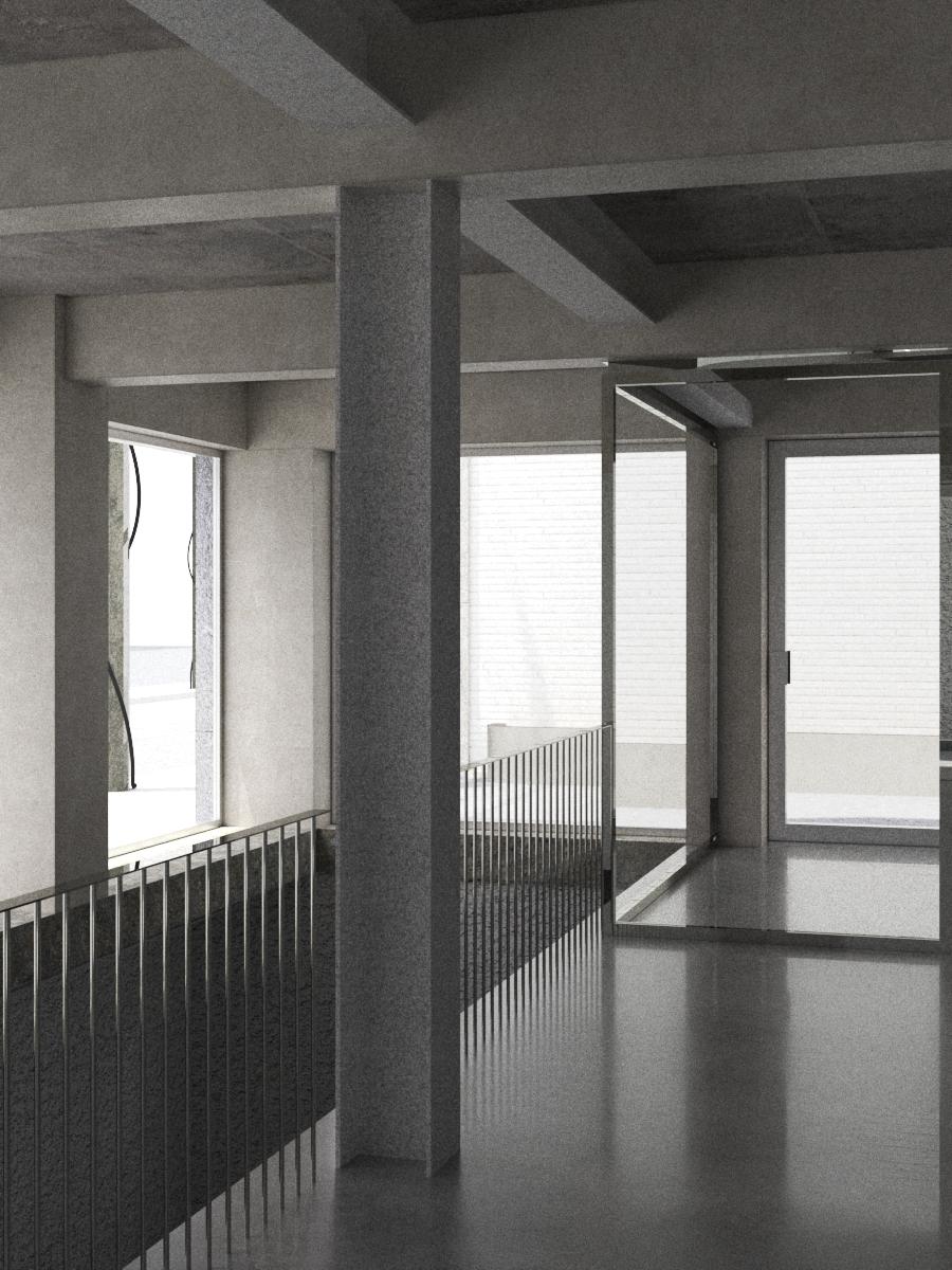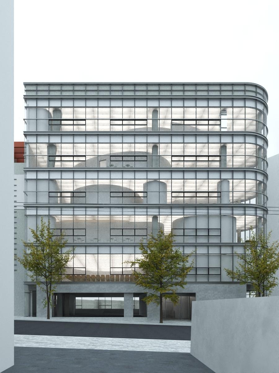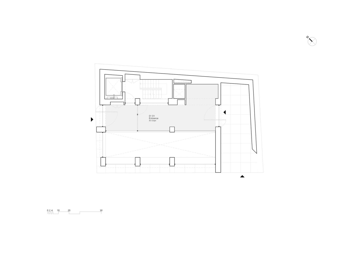 Along the street frontage, a sequence of framed glazed openings at ground level invites views into a large internal void—drawing the gaze downward and offering a glimpse into the reimagined interior. Entry is marked by a slender, five-storey-high vertical slit that cuts through the façade, naturally pulling visitors inward and upward through its dramatic scale and proportion.