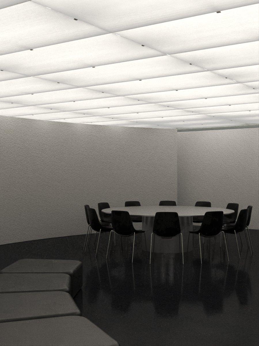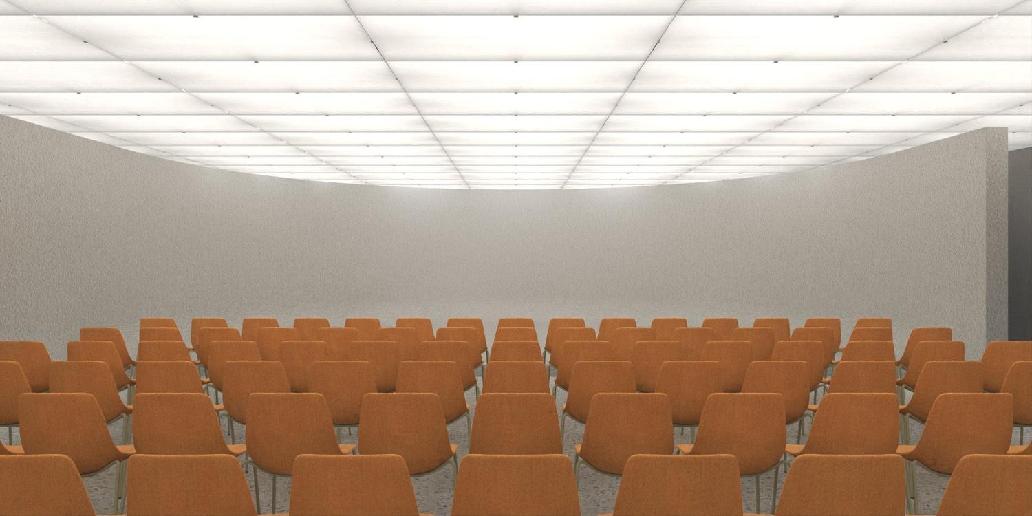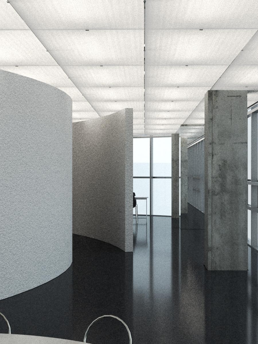 A key feature of the design is the infinity plane used for both the ceiling and floor, creating the illusion of a boundless space. Curved walls, placed like sculptural figures, add movement and visual interest, shaping a dynamic and engaging atmosphere.