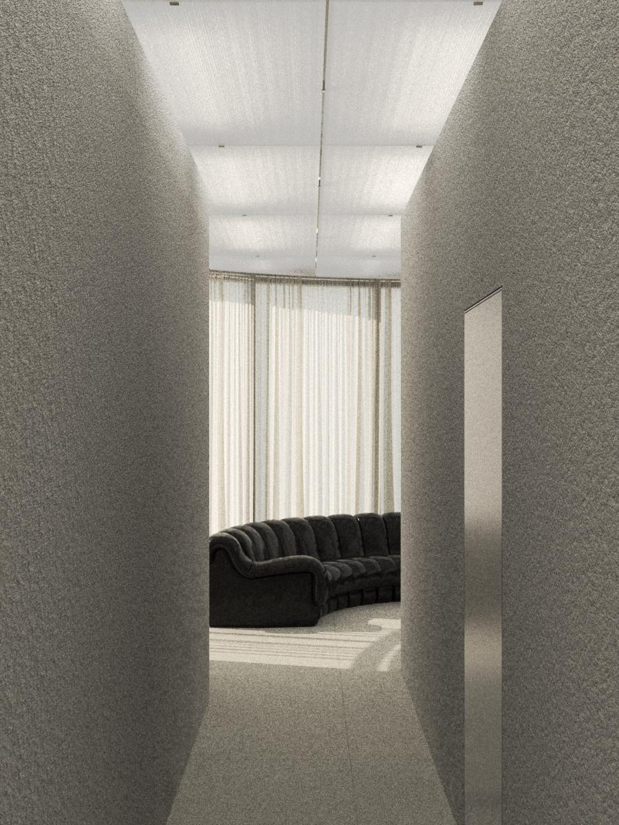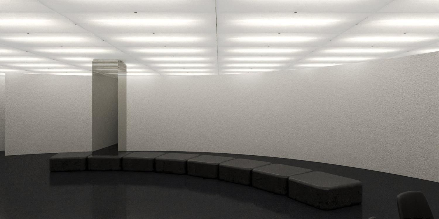 A key feature of the design is the infinity plane used for both the ceiling and floor, creating the illusion of a boundless space. Curved walls, placed like sculptural figures, add movement and visual interest, shaping a dynamic and engaging atmosphere.