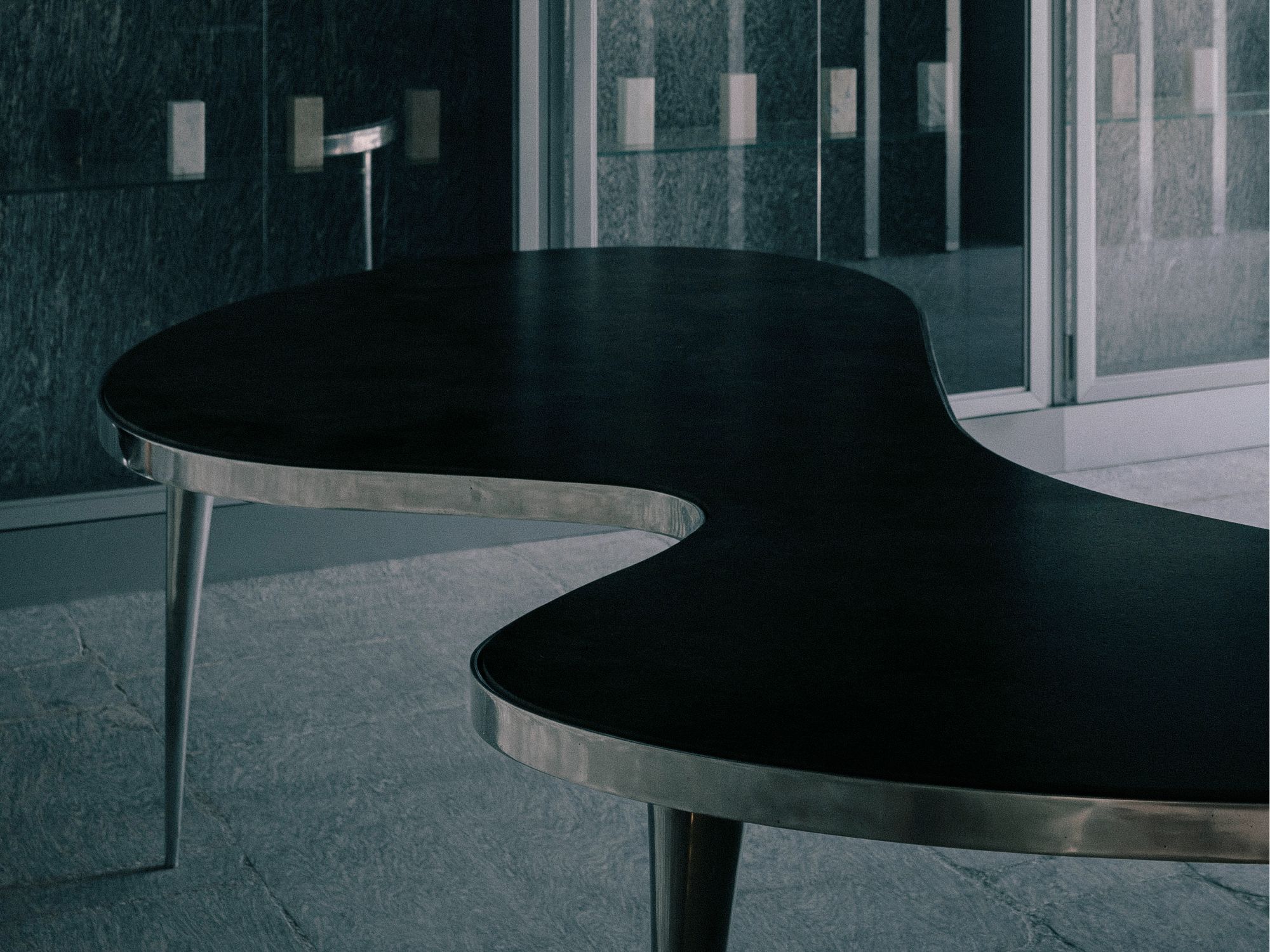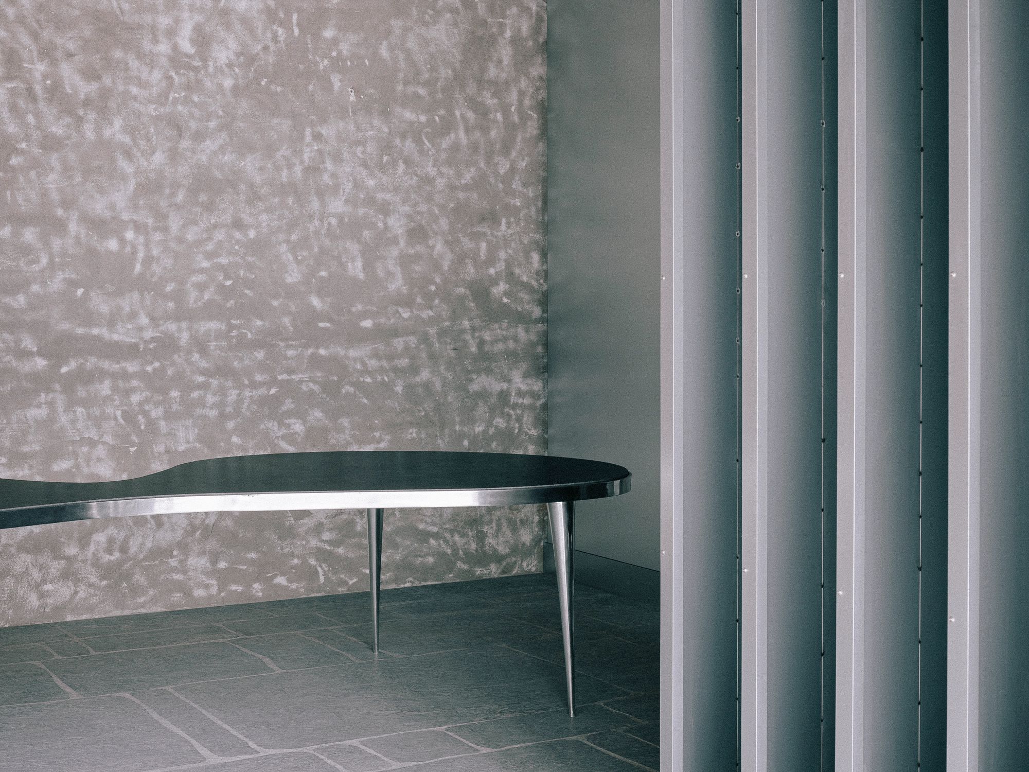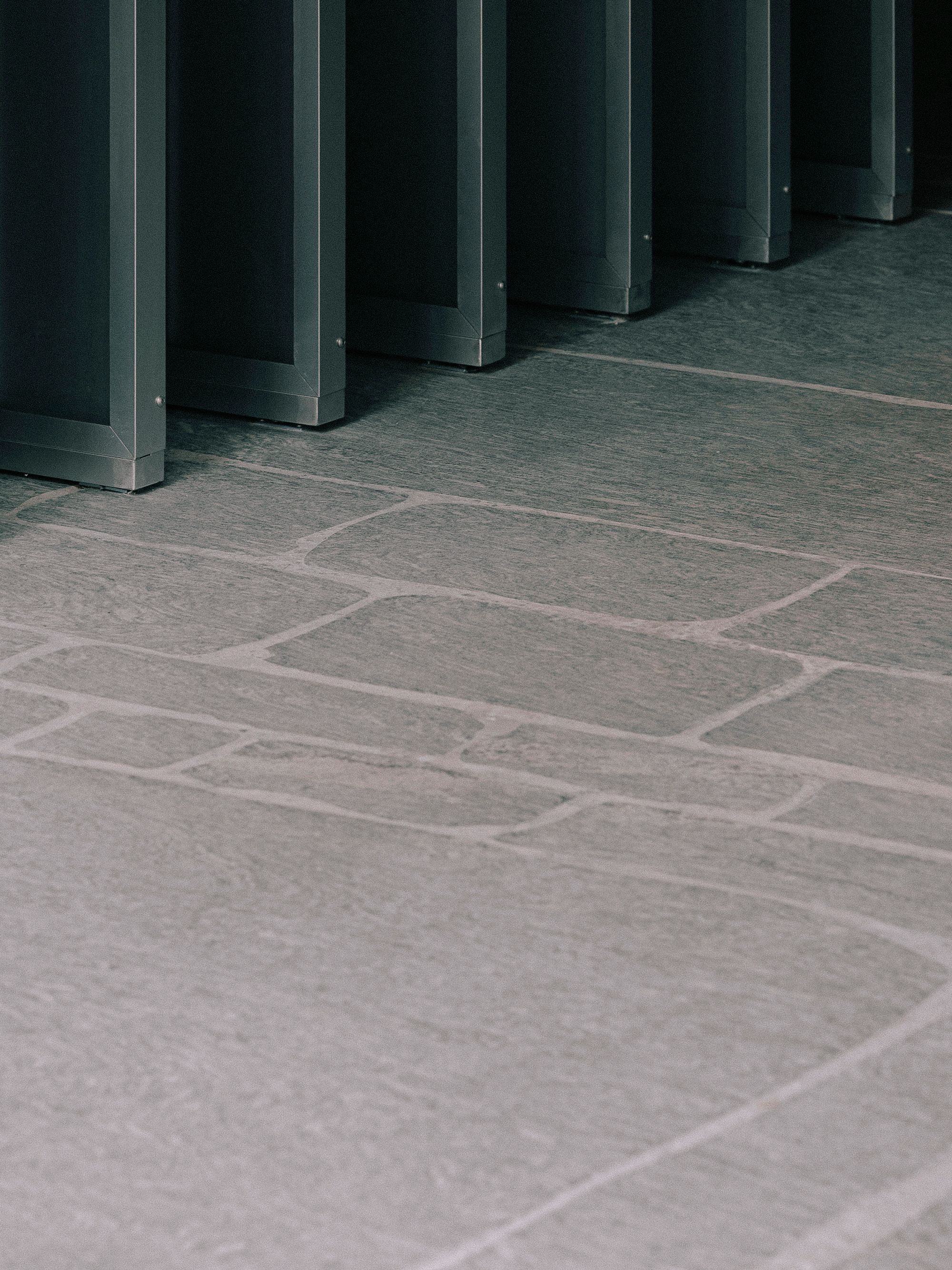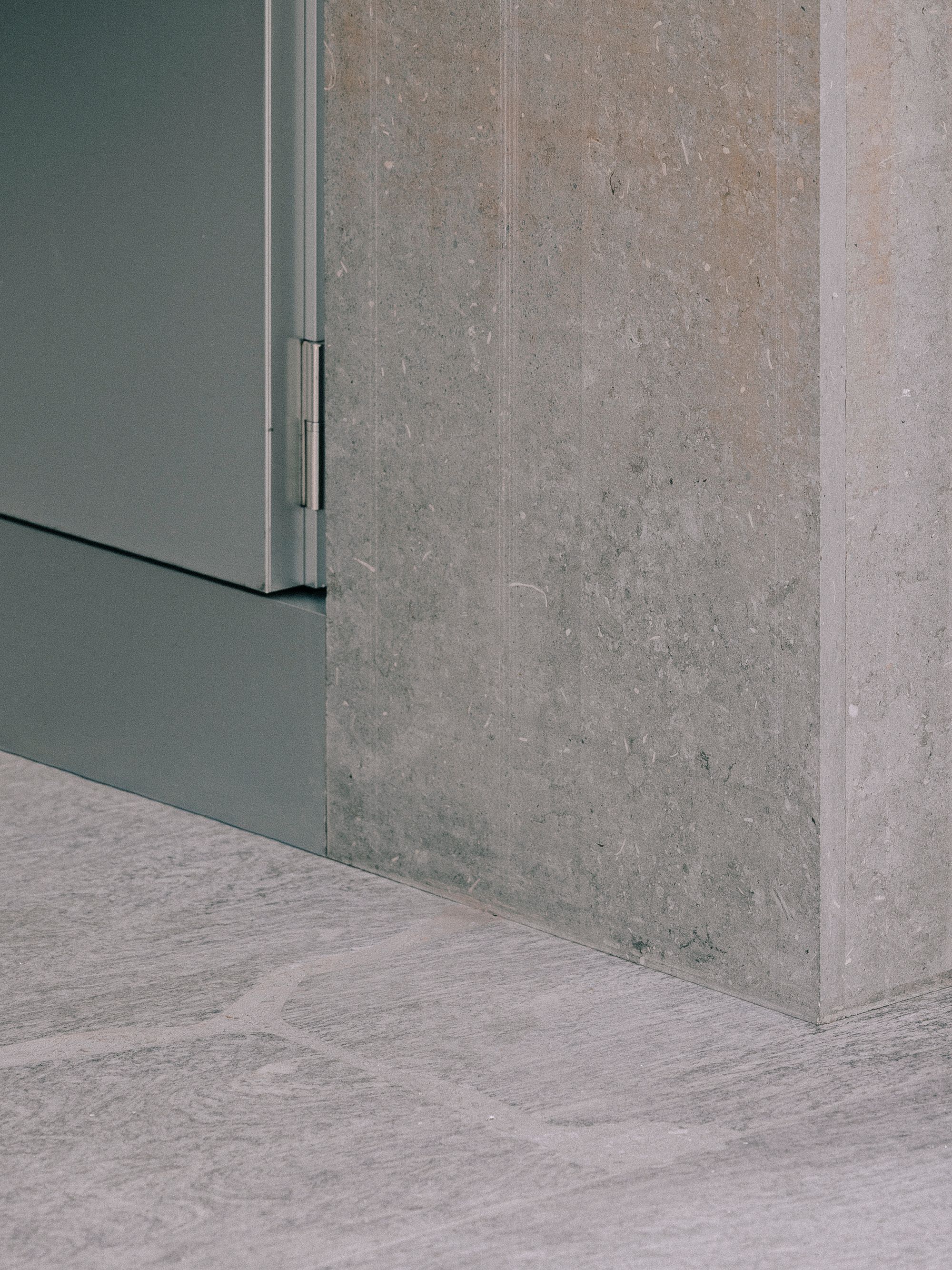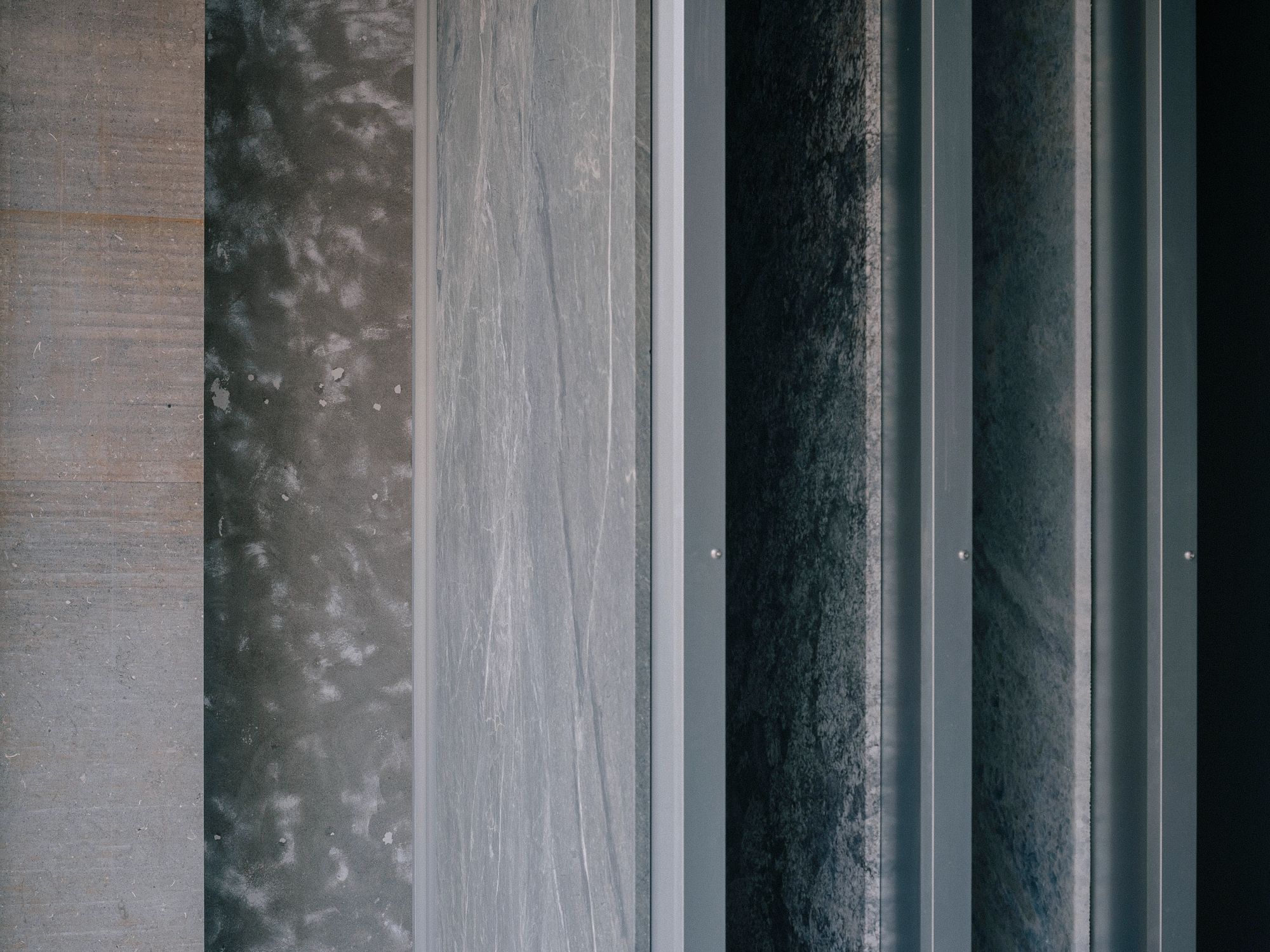 The interior follows a strict 300 mm grid aligning ceiling, walls, and floor. Within this order, cast aluminium furniture and irregular stone compositions introduce moments of looseness. The CNC cut stone floor forms a contemporary interpretation of the Italian flooring technique palladiana. Rather than a conventional showroom, the store operates as an urban archive where selected stones temporarily reside before continuing to architectural projects.