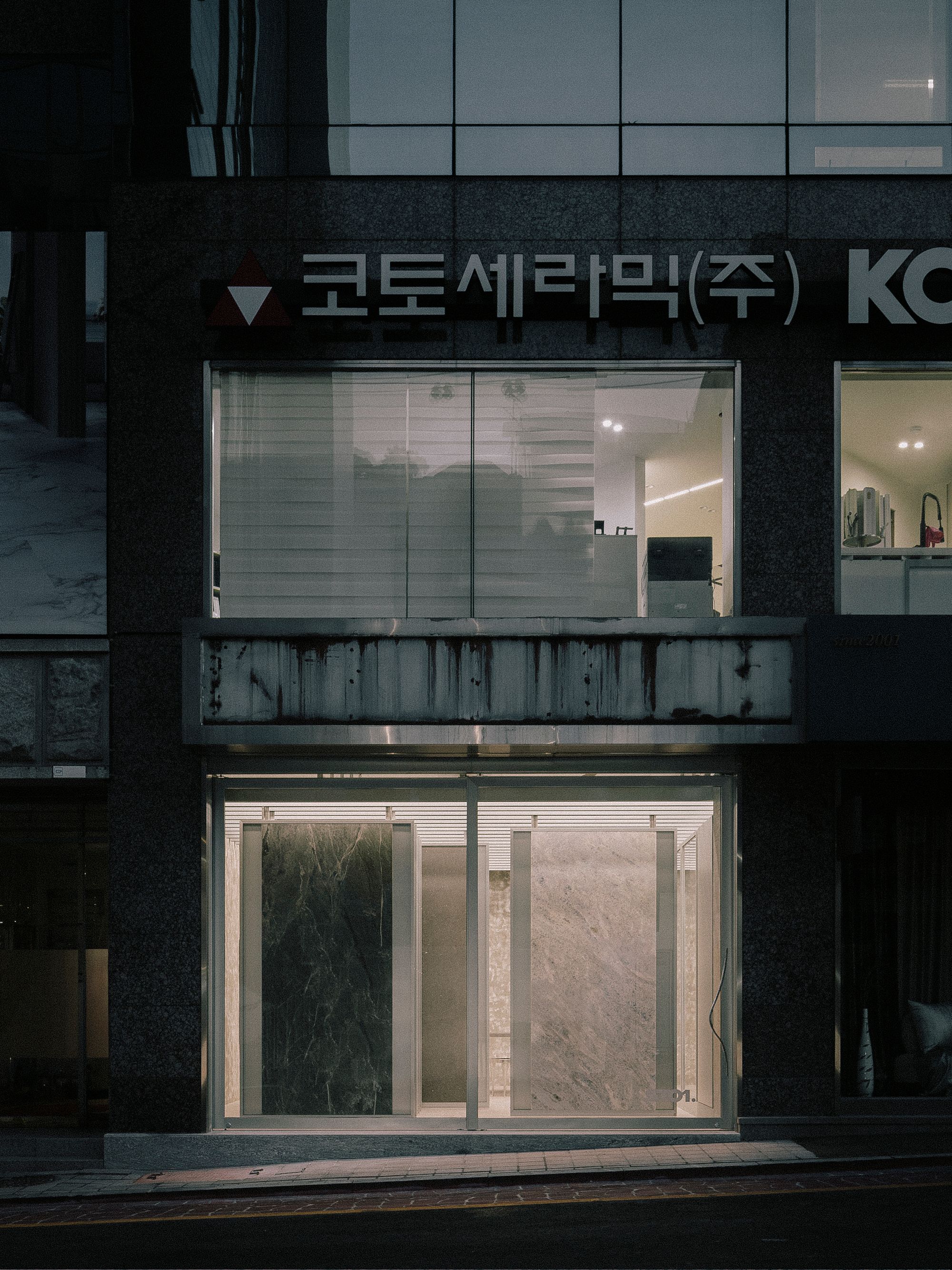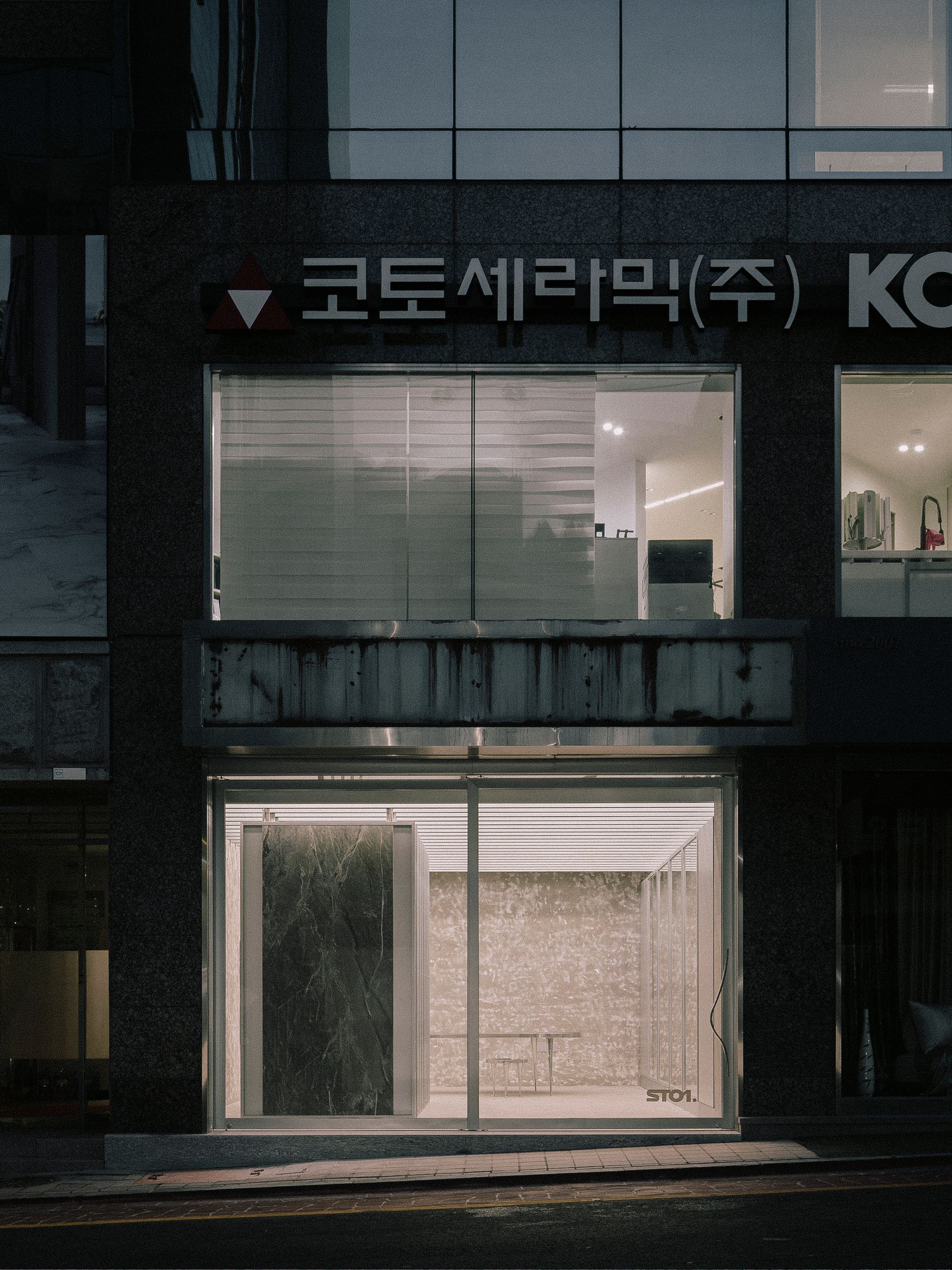 The ST01 flagship store occupies the ground floor of a commercial building within a cluster of architectural material shops near Hakdong Station in Seoul. The term flagship refers not to size but to the place that most clearly represents a brand’s identity and standards. Although only 39 m², the store embodies ST01’s motto, Classic stone, nothing else, allowing stone to become the primary presence of the space.