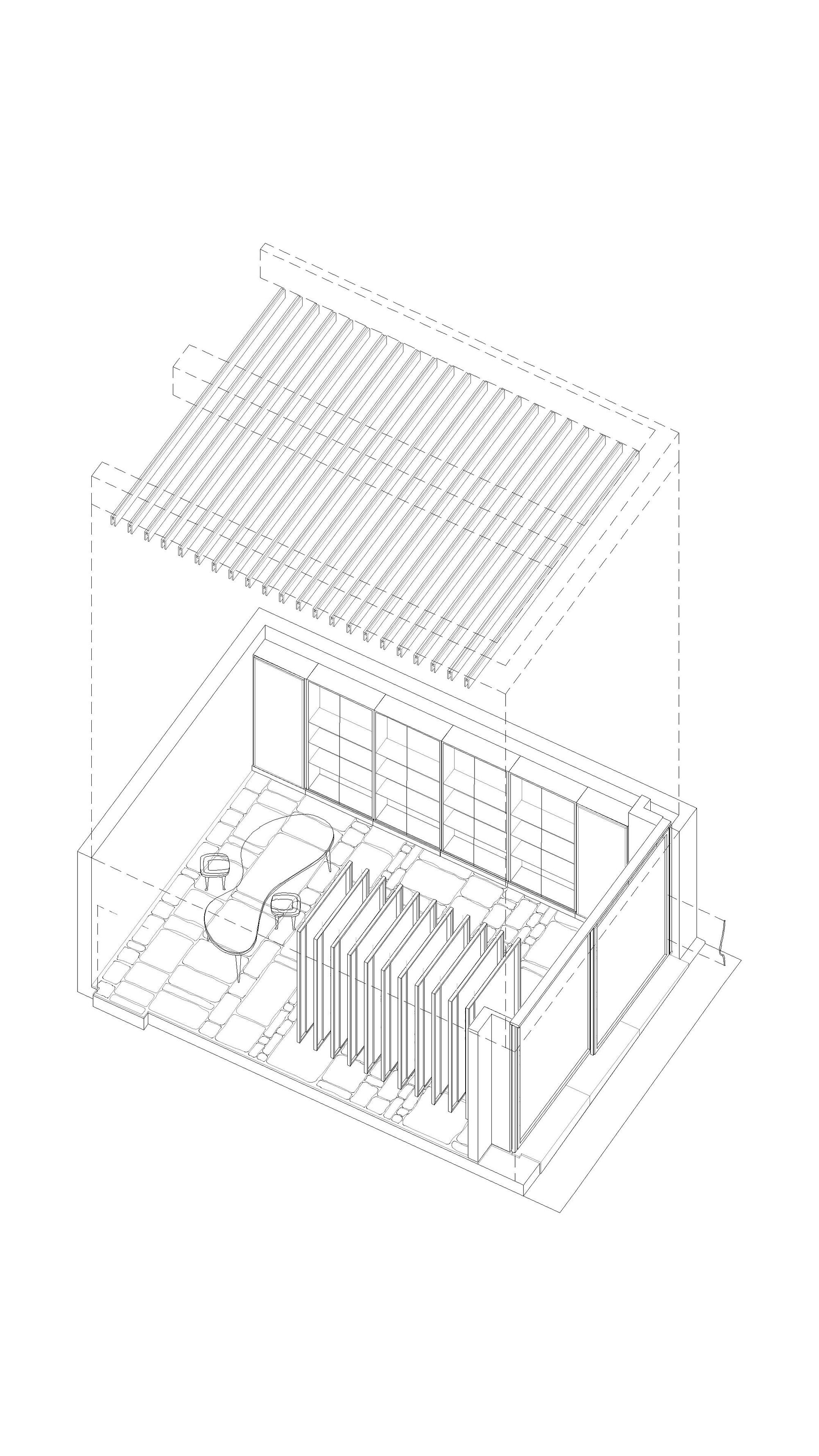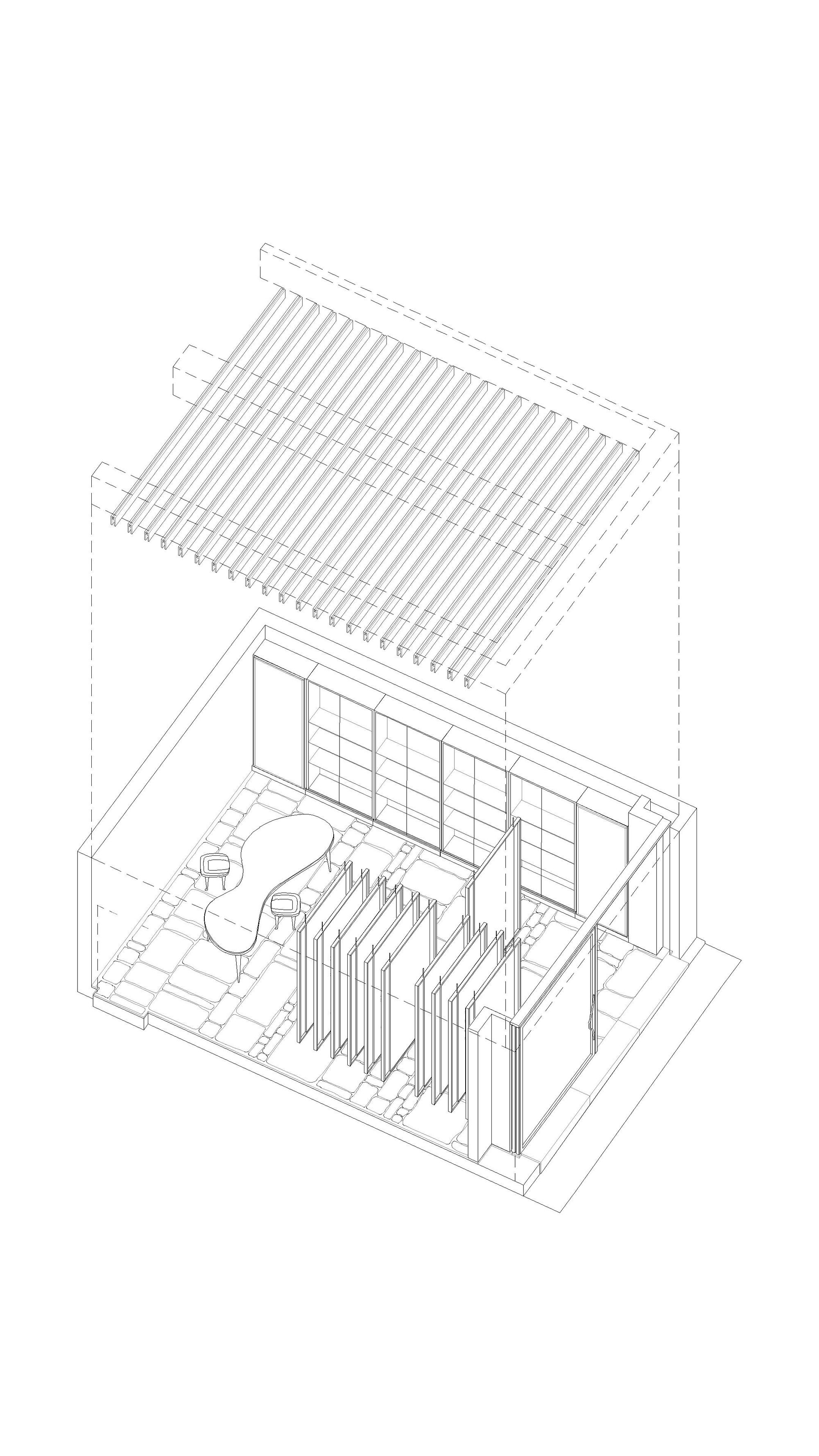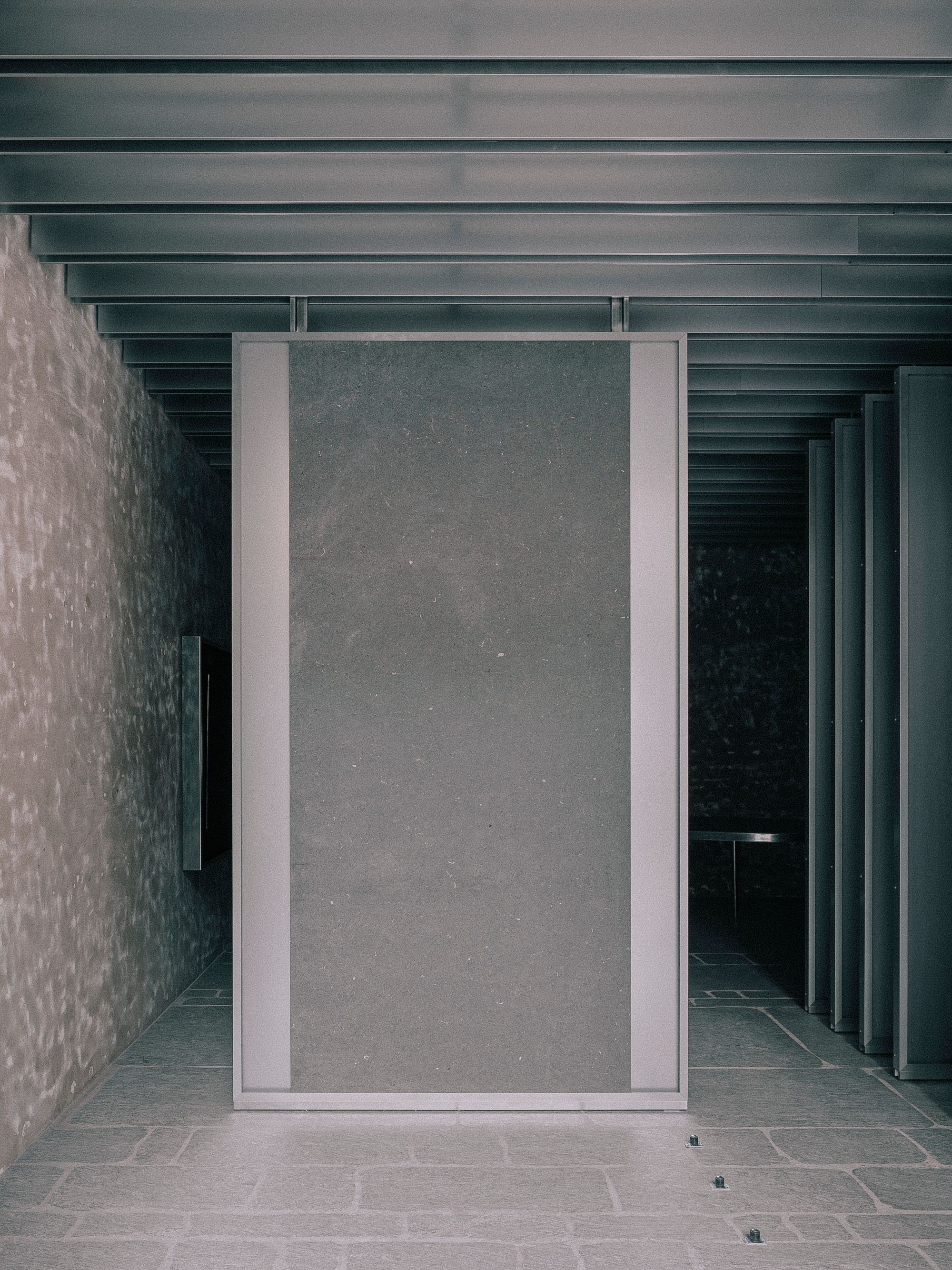 The project critiques typical stone showrooms where materials are displayed as small samples or mounted vertically under artificial lighting, obscuring their scale and character. Instead, inspired by museum archive storage, a ceiling mounted rail system supports steel panels measuring 1600 × 2750 mm, each holding a full stone slab within a metal frame. The movable panels allow viewing from multiple angles under natural light.