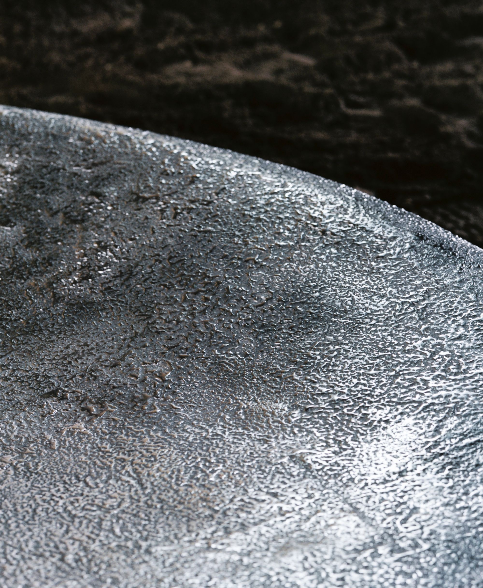 The form is shaped through a reading of movement held within matter. Its surface undulates gently, descending softly across the plane, giving the impression of motion slowed and made still. The texture reinforces this condition, evoking the presence of moving water while remaining solid, a surface that appears fluid yet fixed, quietly registering and holding its surroundings.