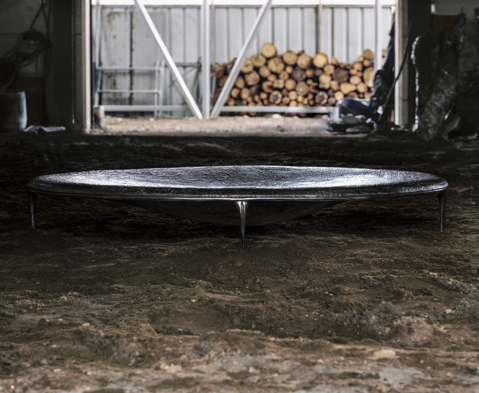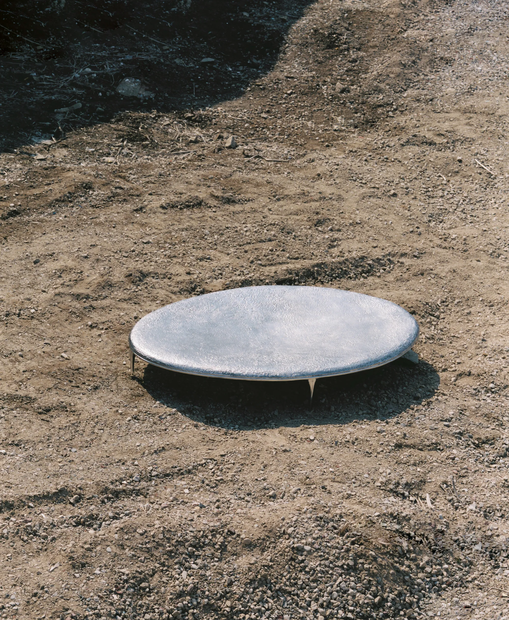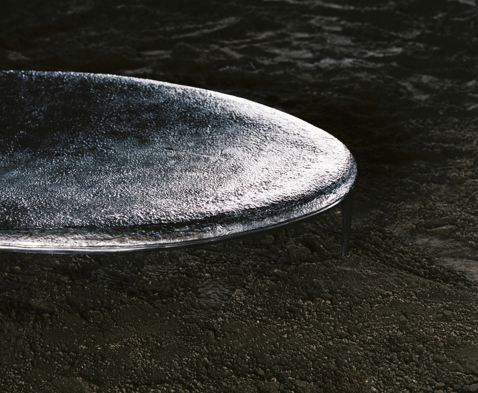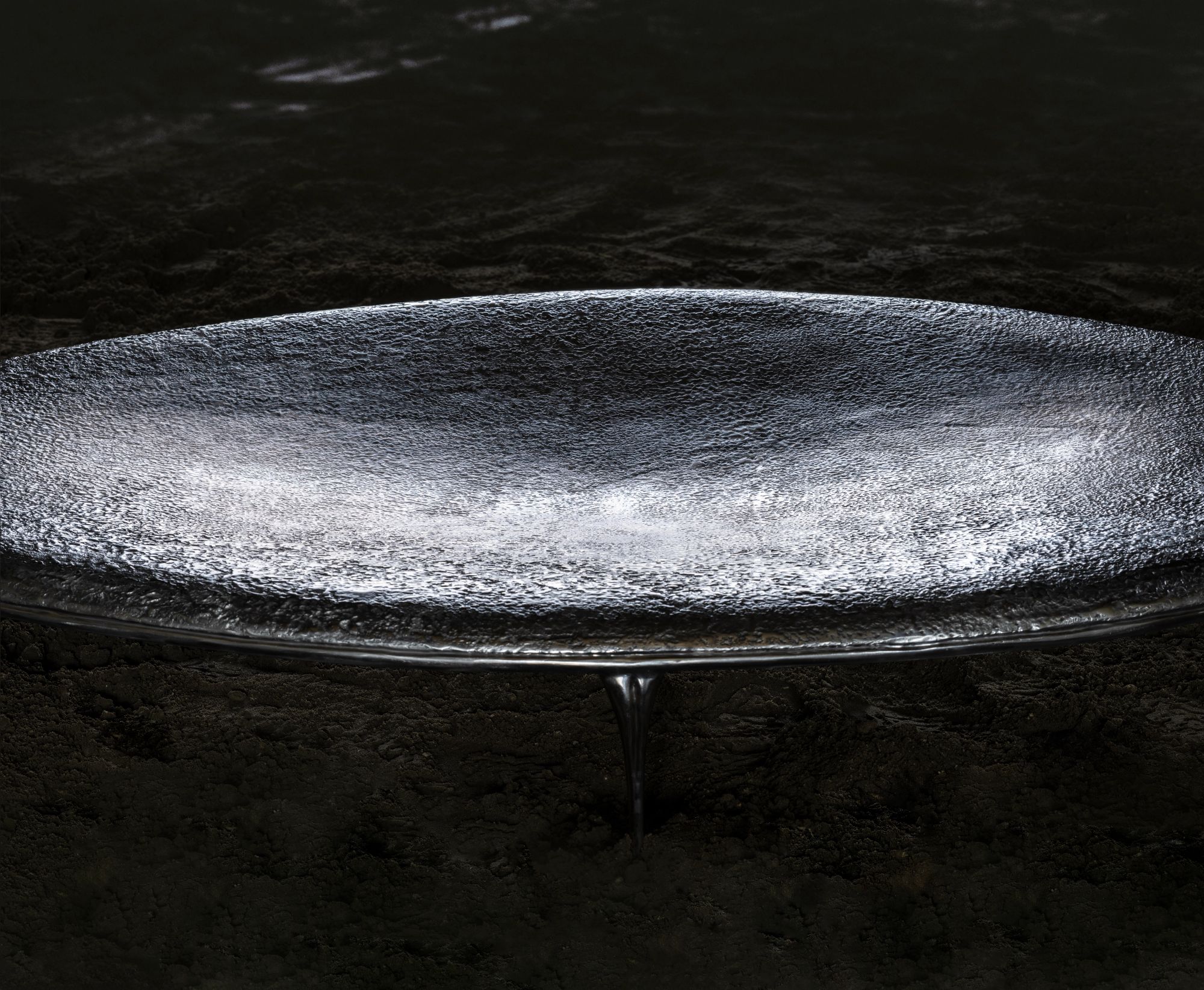 The top is cast aluminium with a textured finish that suggests a fluid surface held in suspension, subtly reflective and responsive to light. Beneath it, the form gathers into a soft, concave underside, reading almost as a belly that draws inward. This volume gives the object a sense of holding, as if it receives and contains what surrounds it. The cast aluminium base, finished in mirror polish, extends into four slender legs that taper toward their points of contact. The density of the form is held in tension as it is lifted delicately on four fine points, giving the impression of a weighty mass momentarily suspended.